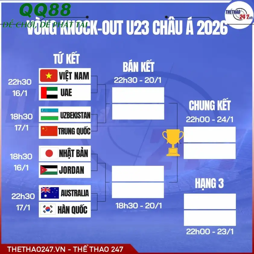 QQ88 GG – Mấy anh em bet thủ ơi, chuẩn bị sẵn sàng cho một trận cầu đỉnh cao sắp tới nào! Cuộc đối đầu giữa U23 Việt Nam và U23 UAE tại tứ kết U23 châu Á 2026 hứa hẹn đầy căng thẳng, khi thầy trò HLV Kim Sang Sik đứng trước thử thách sống còn, một cột mốc quan trọng để chạm tay vào giấc mơ lớn. Các chuyên gia của QQ88 đã “mổ xẻ” từng đường đi nước bước, cung cấp cái nhìn sâu sắc nhất để anh em có thể đưa ra những nhận định chuẩn xác.